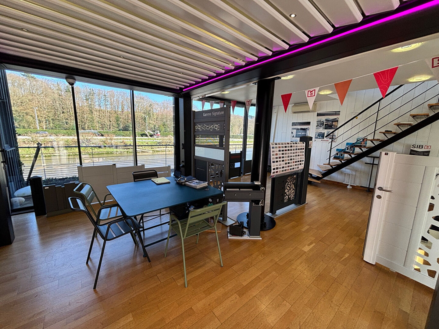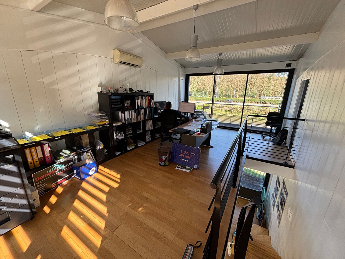 A l’étage, vous retrouverez 3 bureaux avec vue sur la rivière et notamment un balcon ainsi qu’une réserve dans la partie atelier.